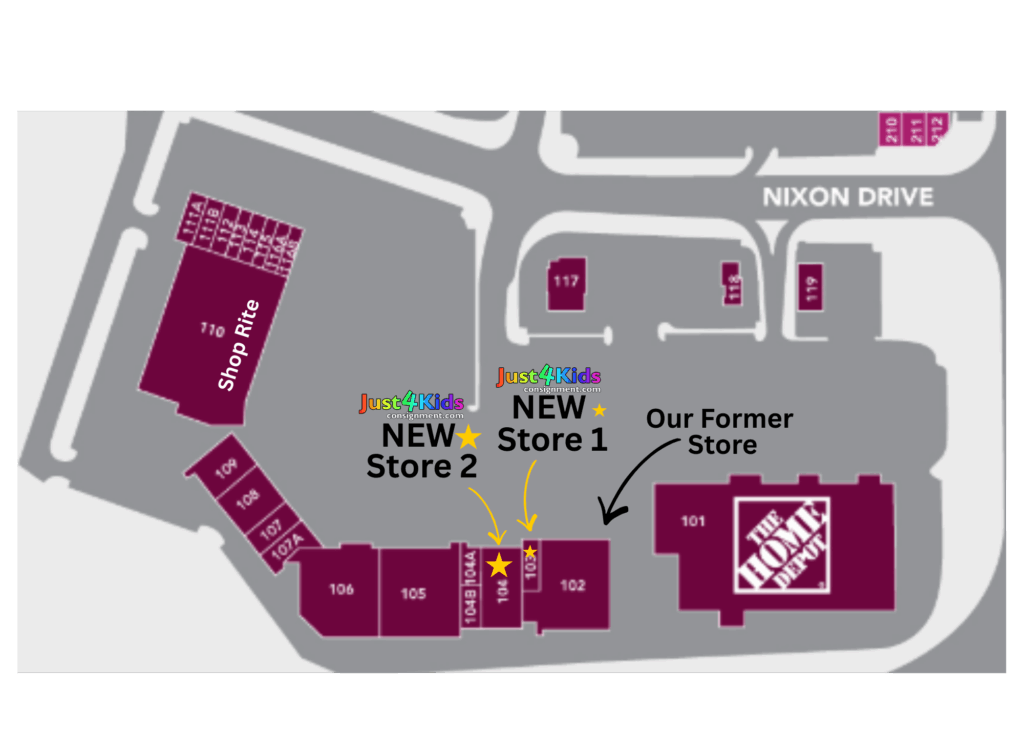 This March we’ll be occupying 2 stores, directly to the right of our previous location. In “STORE 1” (the former Work n Gear) you’ll find all of our larger items like furniture, baby gear, outdoor play, bicycles, and more! In “STORE 2” (the former Party City) you’ll find clothing, shoes, toys, books, and all of the smaller items your kids are looking for.